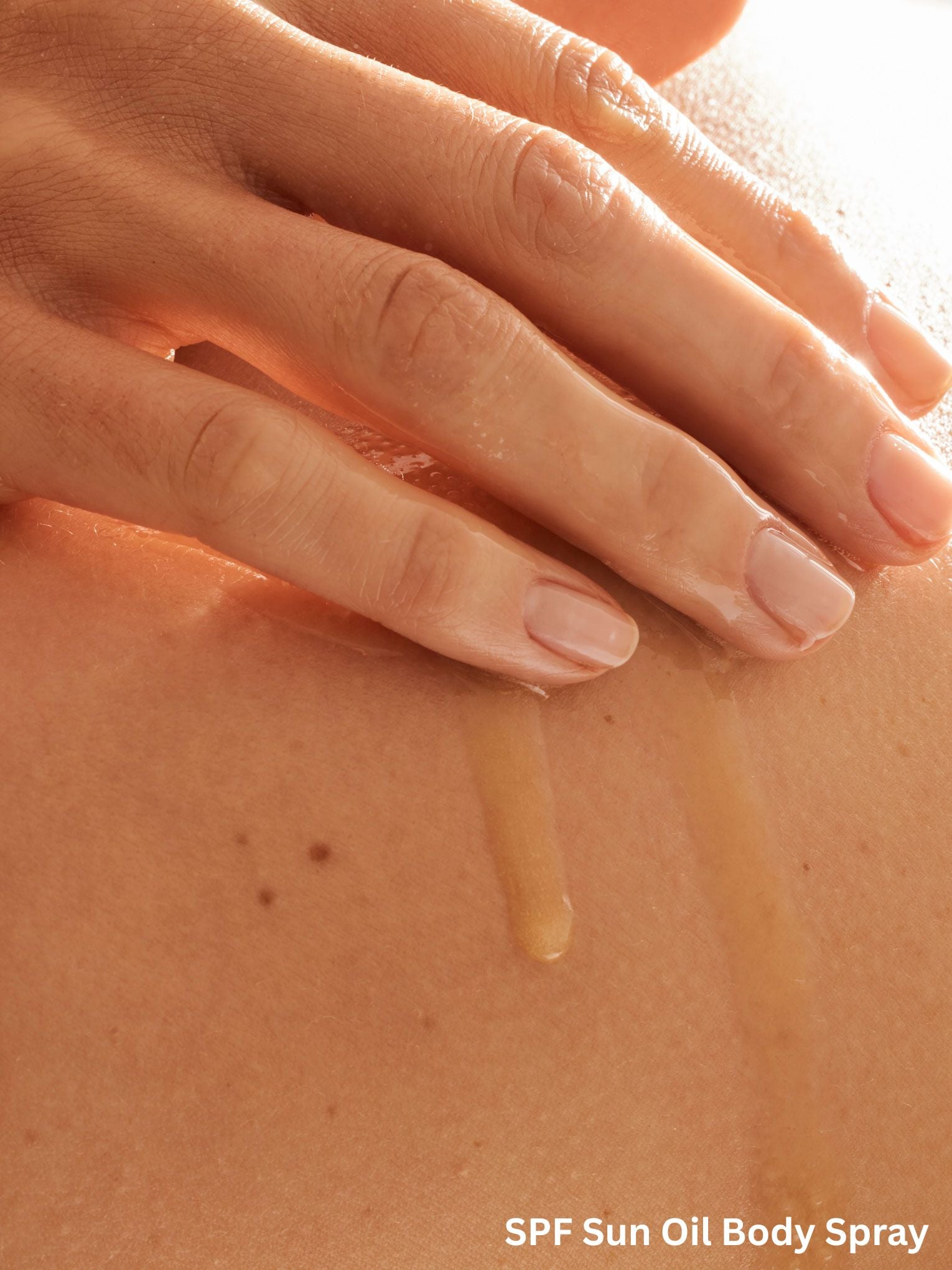 SPF Sun Oil Body Spray : Vaporise généreusement sur ton corps avant toute exposition au soleil. Réapplique tout au long de la journée. De petites quantités réduisent la protection. Réapplique fréquemment pour maintenir la protection solaire, surtout après un contact avec l'eau.