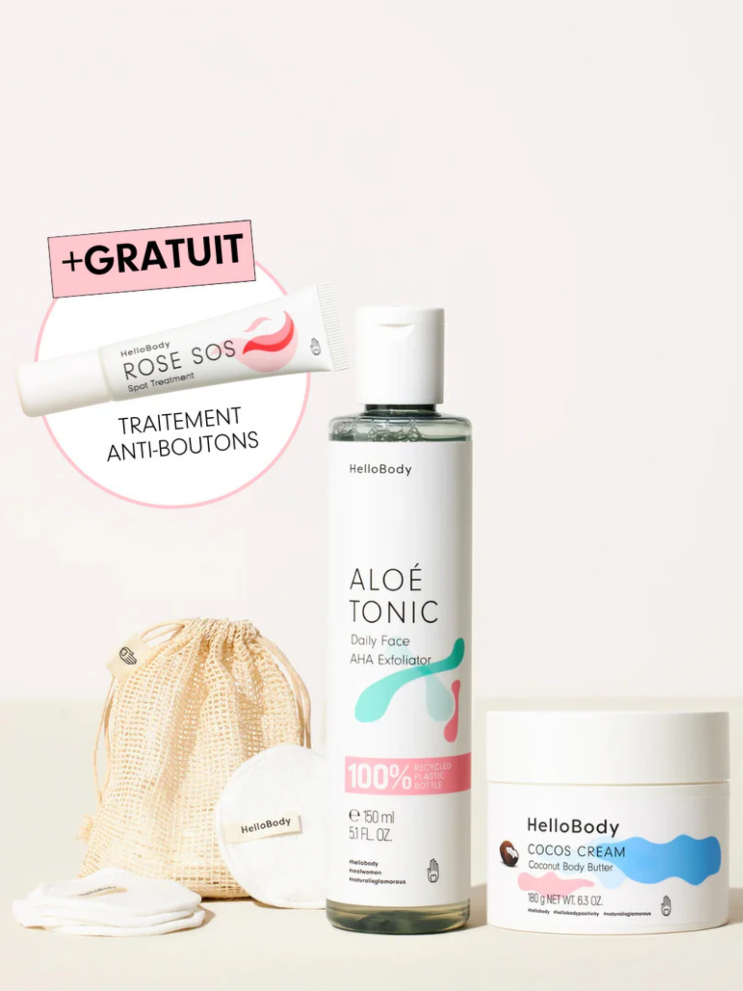 - ALOÉ TONIC (PCR) exfolie et renouvelle la peau, tandis que l'aloe vera, l'eau de concombre et l'acide hyaluronique hydratent et apaisent